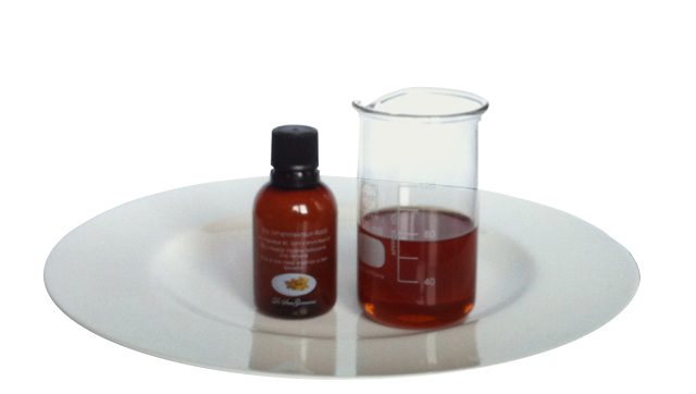 - Das Verhältnis ist ähnlich wie bei EB6 Johanniskrautöl-Jukunda (jedoch werden die Blüten maßgeblich von den Früchten ersetzt) 25g Johanniskraut-Früchte mit Samen und mit den noch vorhanden Blüten (der Jahreszeit entsprechend), mit 100g bestem Olivenöl übergossen bis Ende Oktober auf einem warmen Platz im Sonnenlicht mazeriert. Anschließend gefiltert und in unseren 50ml Fläschchen abgefüllt. Die Farbe des Öles wird, wie dargestellt rotbraun klar, entsprechend dem Gemisch der Früchte und der Blüten.